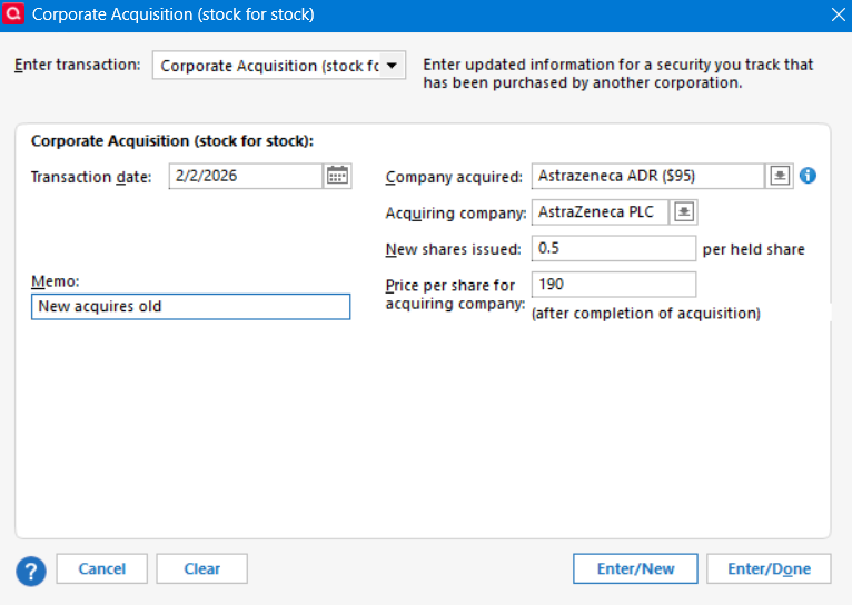 Strictly speaking, this is not a stock split, as Jim identified, though you may want to treat it that way. Going the stock split route, you would also want to change the ticker (ASTR to AZN), change the name (dropping the ADR suffix), and uncheck the “Matched with online security” box so the the Quicken security can get matched to the new CUSIP. Treating it as a stock split would let Quicken compute and report performance measures in a way that would seem more intuitive.