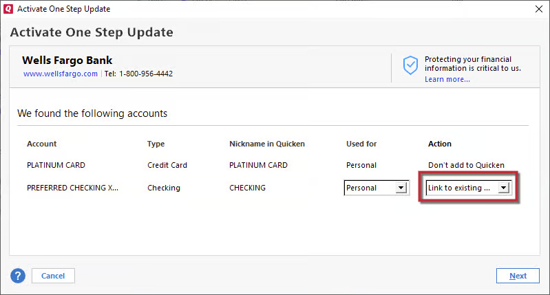 - Select Don’t add to Quicken for any accounts you do not want connected
