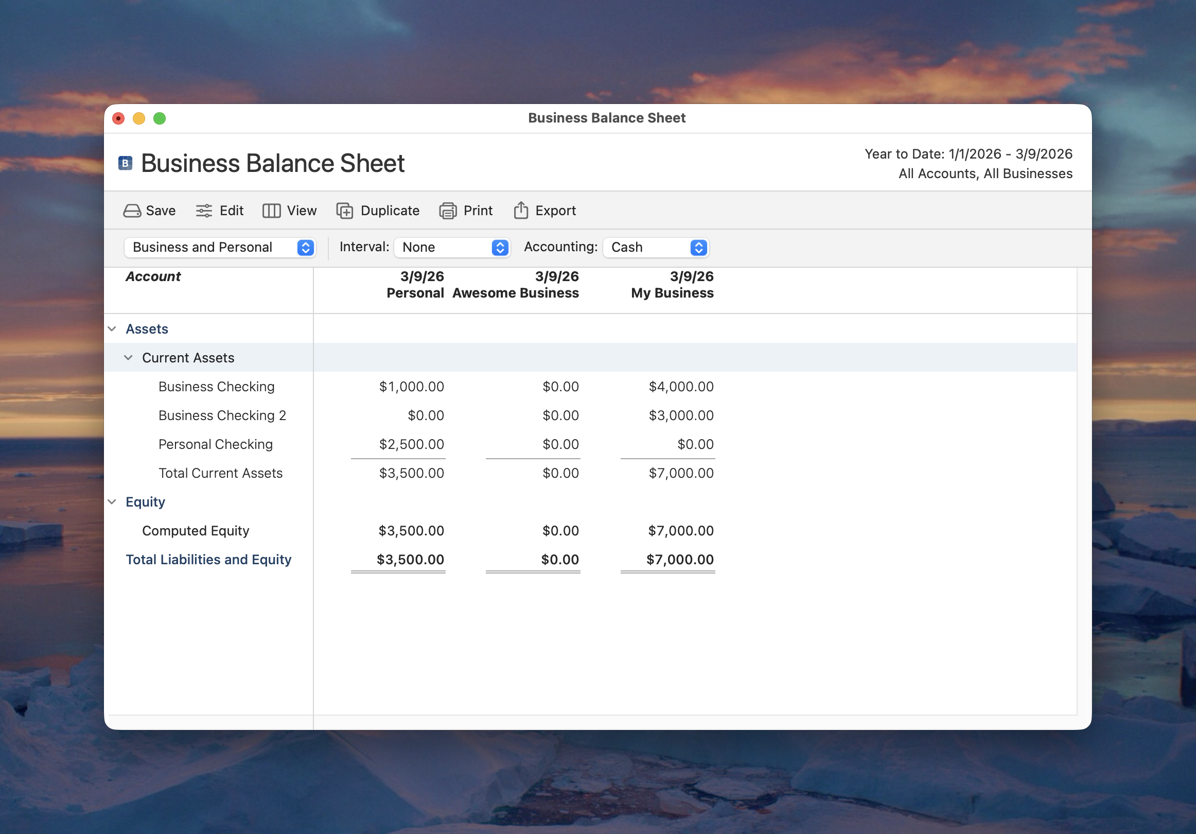 Taking a look at the Business Balance Sheet report, we can now see under Business Checking $1,000 of that is Personal and $4,000 is My Business.