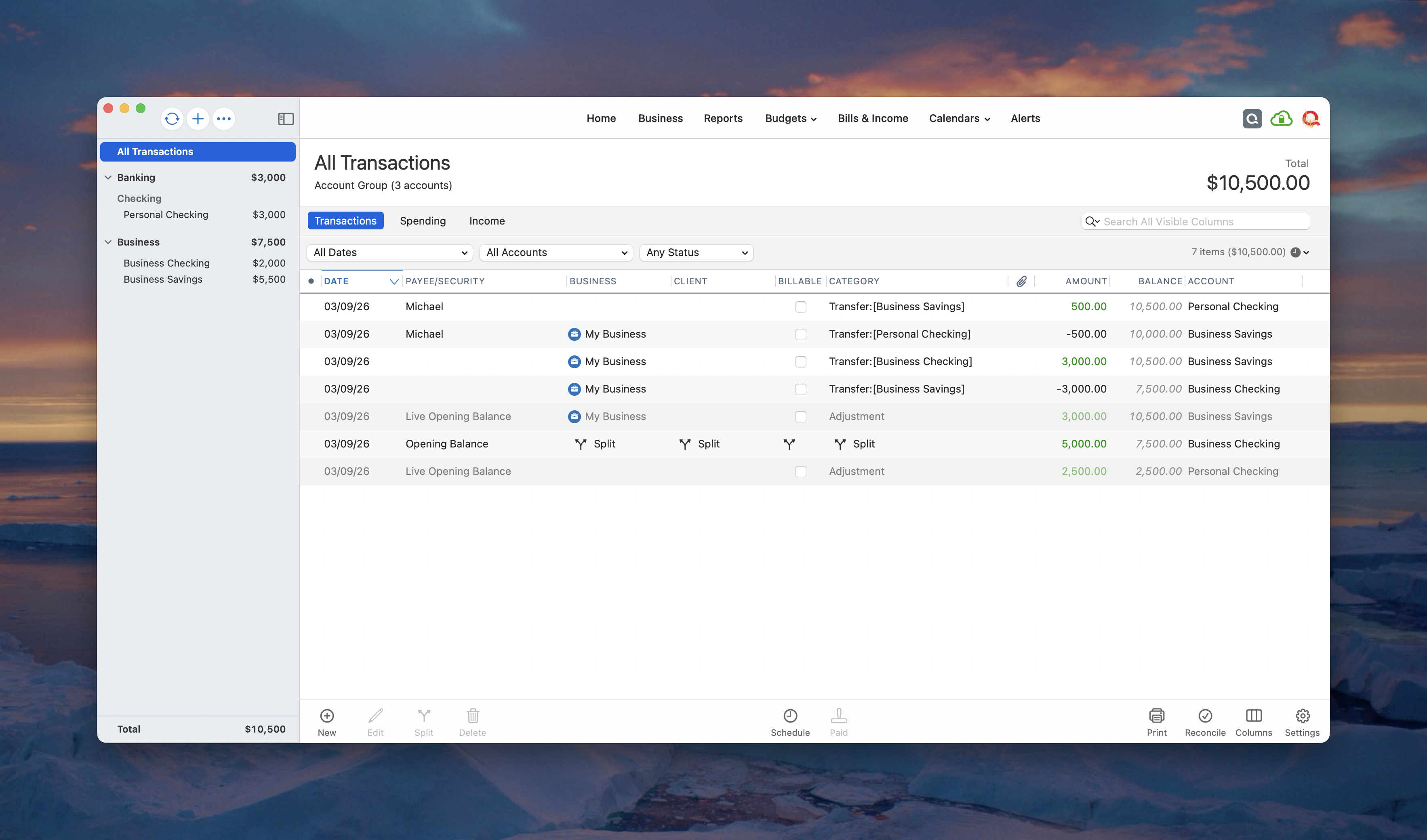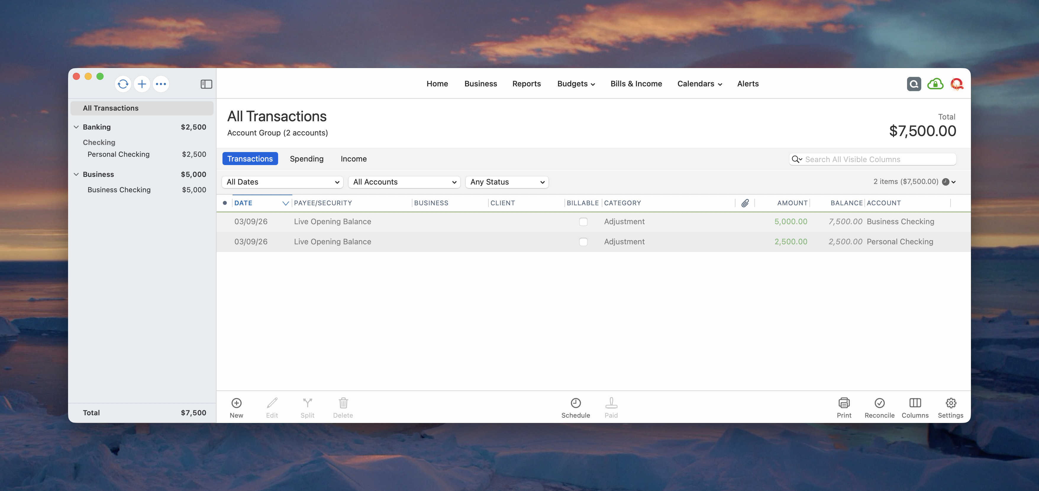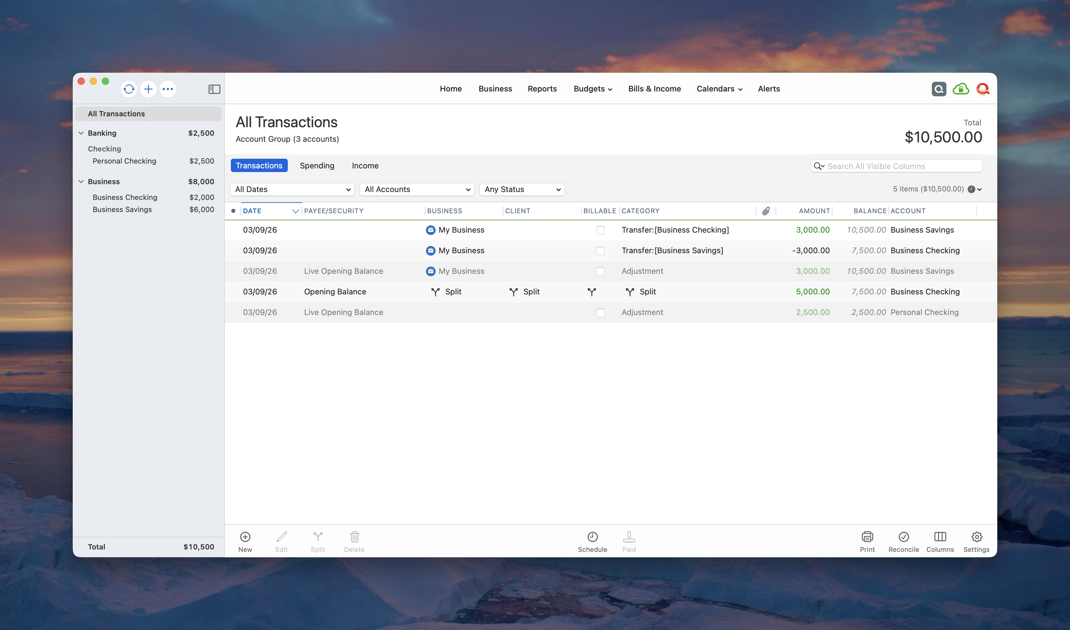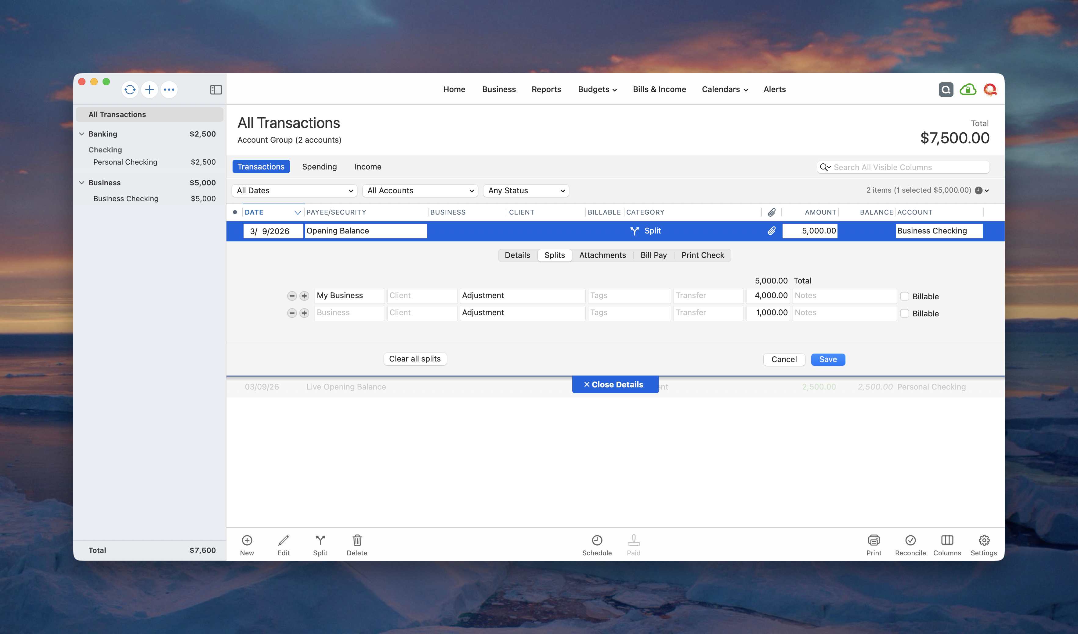 Additionally, if you mix business and personal in a single account and the business existed in that account before it was added into Quicken, then you would have to know the amount of the opening balance that was assigned to personal and the amount of money that was assigned to a business. So if Business Checking had $1,000 that was to be assigned to Personal and $4,000 assigned to My Business. You would edit the opening balance transaction in the account as a split transaction.