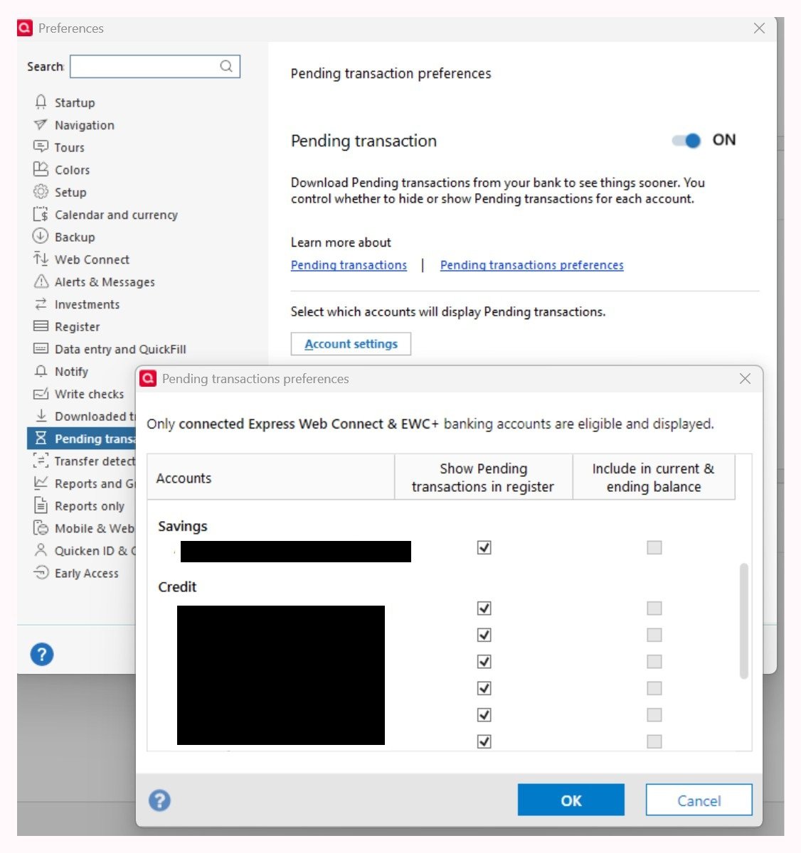 All my other accounts (Capital One Visa, Citi Bank Master Card) behave as they should when reconciling. In those accounts the balance Quicken uses does not include pending transactions, even though the pending transactions can be viewed.