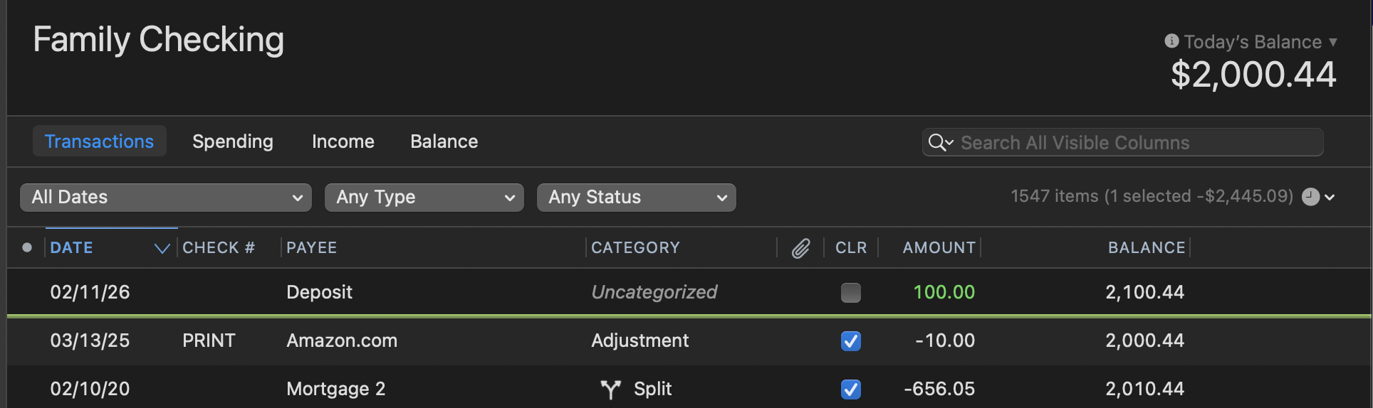 Also, around the start of a new year, it's easy to mistakenly enter a transaction in the wrong year; I entered a few transactions in January which "disappeared" until I realized I typed a month and day but not the year, and the year was defaulted to 2025 from the previous transaction — so I ended up creating a January 2025 transaction instead of January 2026 as intended.