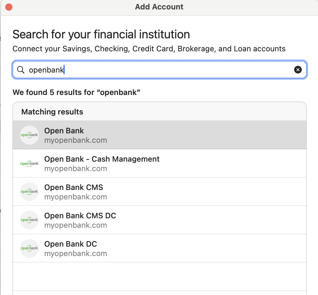 When I try to add an account in Quicken Mac and type "openbank" in the search field, I do find Openbank is available to add: