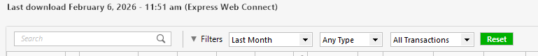 4. Click the Reset button at the top of the register. This will confirm that there's no filtering in your account register. (Note - If there is no reset button, that means you have no active filters.)