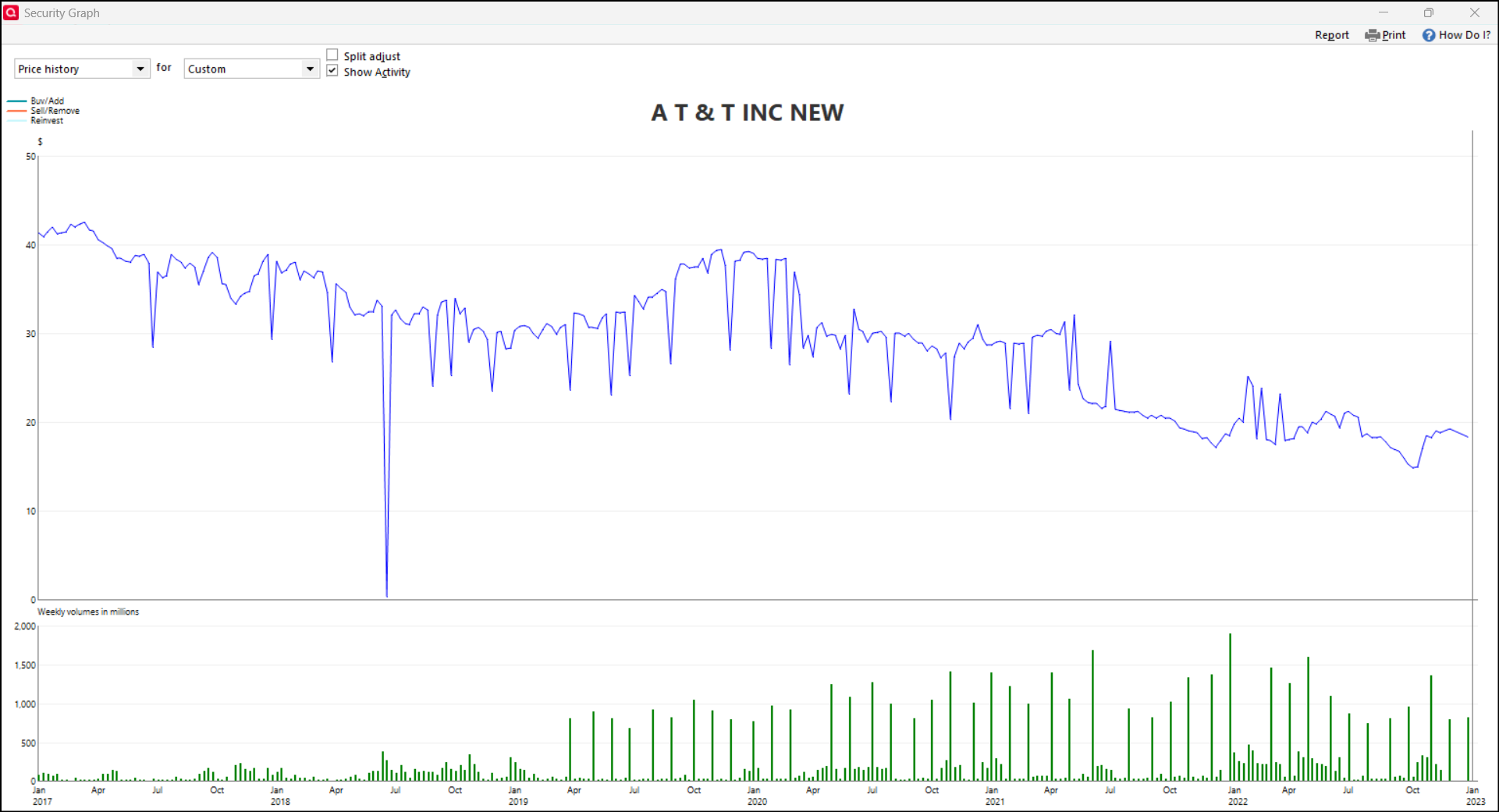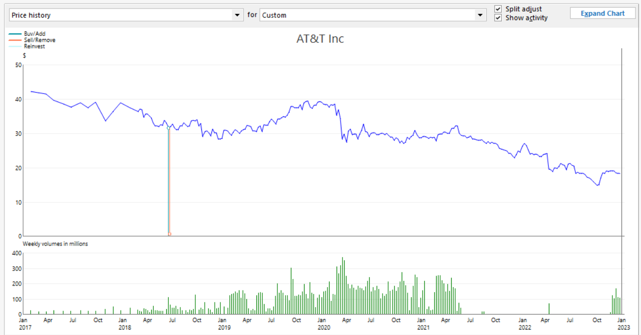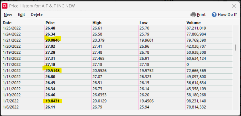 @bebob My secondary file owned AT&T continuously through that 2022 time period. As such, the prices were getting downloaded from Quicken's third party data supplier regularly (the #2 in the hierarchy of sources). My main file did not own AT&T through that time period. I believe (or suspect) that the prices after October 2020 were filled in from the Historical price source in late 2022 when I bought back in. So those January 2022 prices were the Friday closing prices adjusted downward by the 75% factor due to the April 2022 WBD spinoff with the data from the #3 source in the hierarchy.