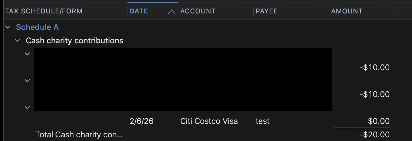 You could put a tag on it. I create a tag for each tax year (TY2026 ,for example) and tag any tax related transactions with it. Then I have a Tax Schedule report saved for each year that filters on that year's tag. $0 amount transactions will show up in that report as long as they have the tag for that year and have a tax related category.