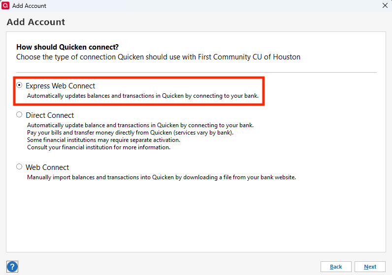 - Make sure Express Web Connect is selected, then click Next.
