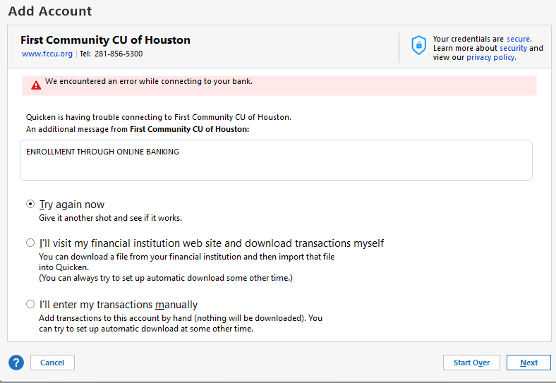 Since it works in Quicken Simplifi, but gives you trouble in Quicken Classic, I suspect what is happening is that you may be trying to connect via Direct connect in Quicken Classic. Based on your screenshot, Direct Connect requires you to do some form of enrollment through the financial institution before it will allow you to connect.