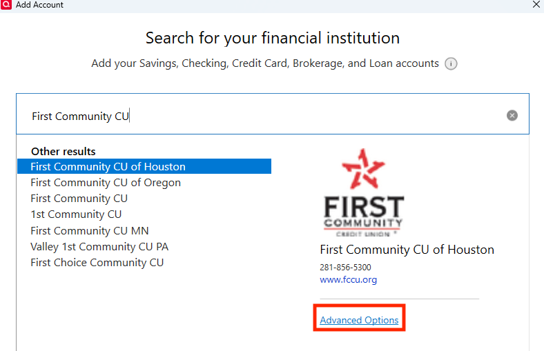 - Search for First Community CU of Houston, and click the blue Advanced Options link.