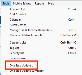 Clicking on the One Step Update, with the revolving circle, I get a drop down menu. On this menu, only the One Step Update is "active" and it looks like will allow for the one-by-one updating of transactions by selecting individual accounts; (I've selected one for a trial with no issues); all other options on this menu seem to be "bricked".