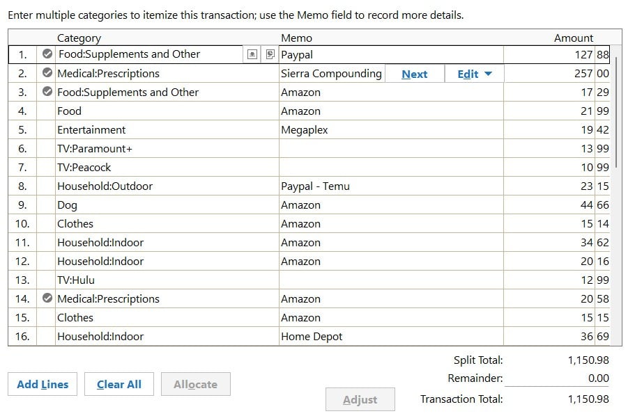So "Amazon" may come up 20 times while entering all of the line details, each with different Categories