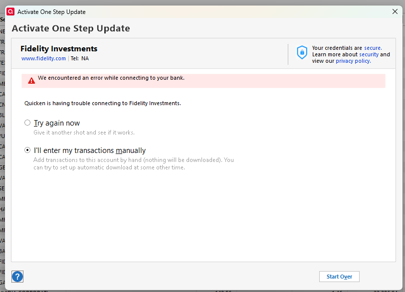 My previous post has been closed, so I am starting a new one with updated information. I have two Quicken Classic files residing on my OneDrive with multiple Fidelity accounts that I can no longer connect for automatic transaction downloads from Fidelity. These files worked fine until the Fidelity connection method changed late last year. Now all I get is this message when trying to reconnect these accounts: