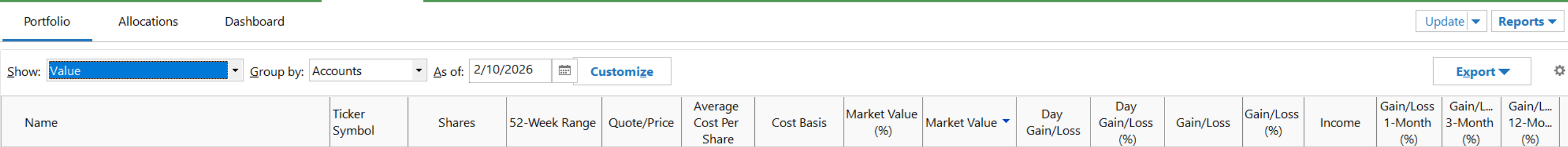 Unless you created it, there's not a "Value" view under the Investing tab. Perhaps do you mean Portfolio?