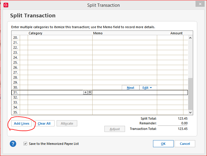 If you need more than the original allotment of 30 lines, simply click the Add Lines button and additional lines will be added to the dialog, in increments of five.