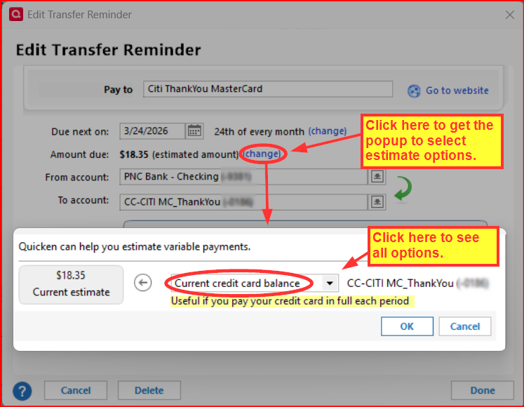 Reply back if you need help setting up the reminder for the credit card payment. The beauty of that is that it always automatically shows the current credit card balance. Then once the credit card statement cuts off I post the reminder in the register on the due date. This then "freezes" that payment and the next month's reminder starts accumulating any new charges.