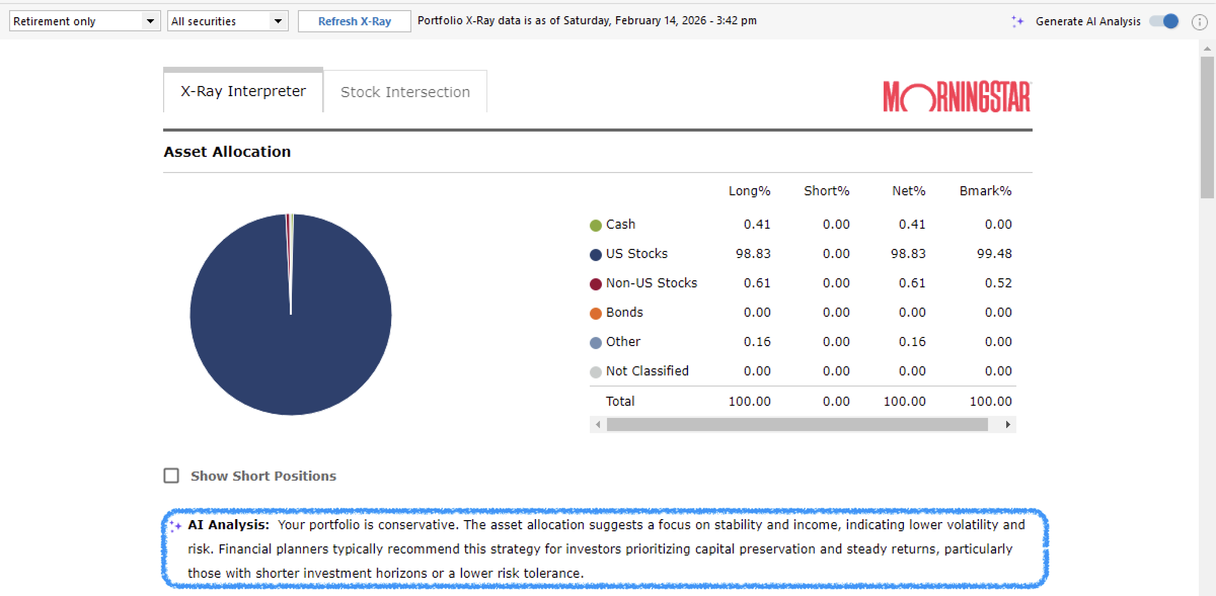 Attached is the Vanguard total US stock market ETF (VTI) alone. Asset allocation is correct and the Stock Intersection report is correct, but the AI doesn't see it apparently.