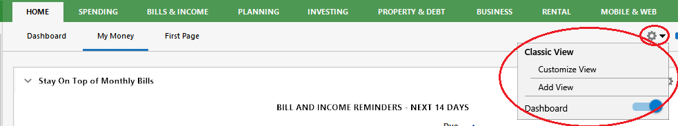 In addition to the Home tab's Dashboard view do you also have a selection named My Money or similar?