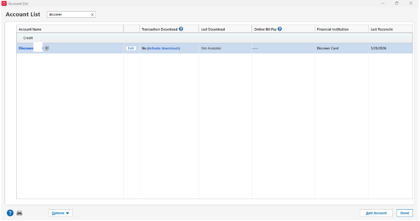 To resolve the issue, backup your Quicken file and deactivate the problem accounts. Then, navigate to Tools>Add Account, search for Discover Card, and follow the prompts, making sure to carefully link to the correct nickname in Quicken.