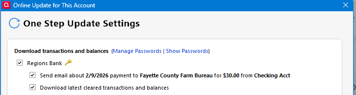 Created an email reporting a bill payment not yet received by the company via Quicken. OSU now fails with password not correct error. If I uncheck the "send message option," bank connects properly.