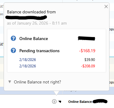 Clicking on the "i" next to Online Balance in the lower part of screen, it shows an as of date of January 26 (see attached screenshot) - it is the same date for all accounts. After downloading, reconcile just says there is nothing to reconcile I assume because all the downloaded transactions are after January 26. Resetting the accounts has no affect.