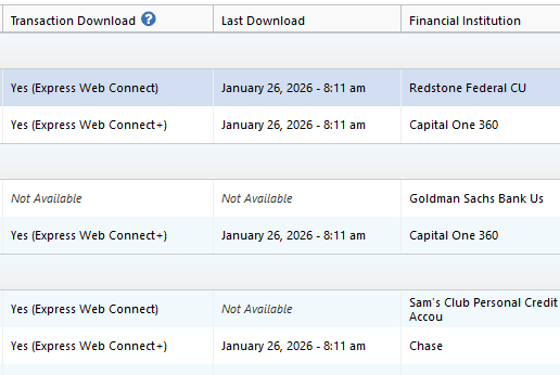 Interestingly all the problem accounts (Except for Sam's Club) show a last download of Jan 26 but I download transactions every day. T