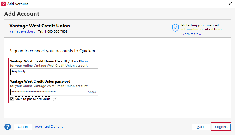 - The connection type will be listed below the Financial Institution name.