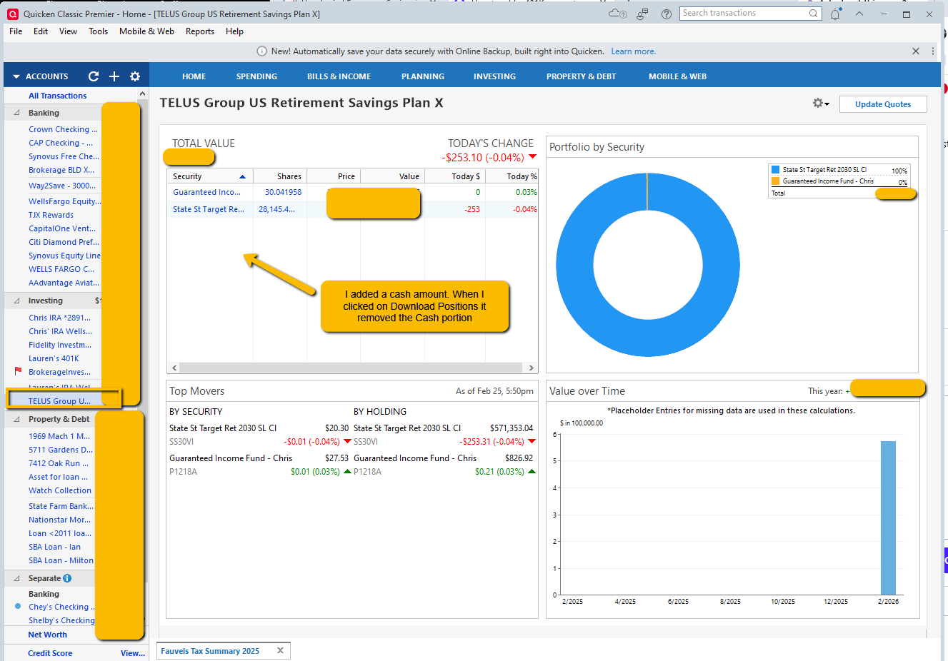 When I clicked on the Download Positions button while in the retirement/investment account, it removed my previously entered Cash balance for the retirement account in question.