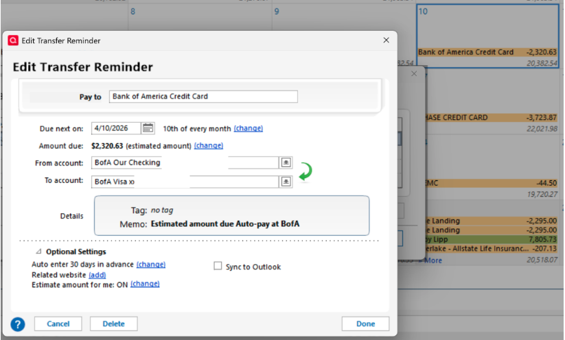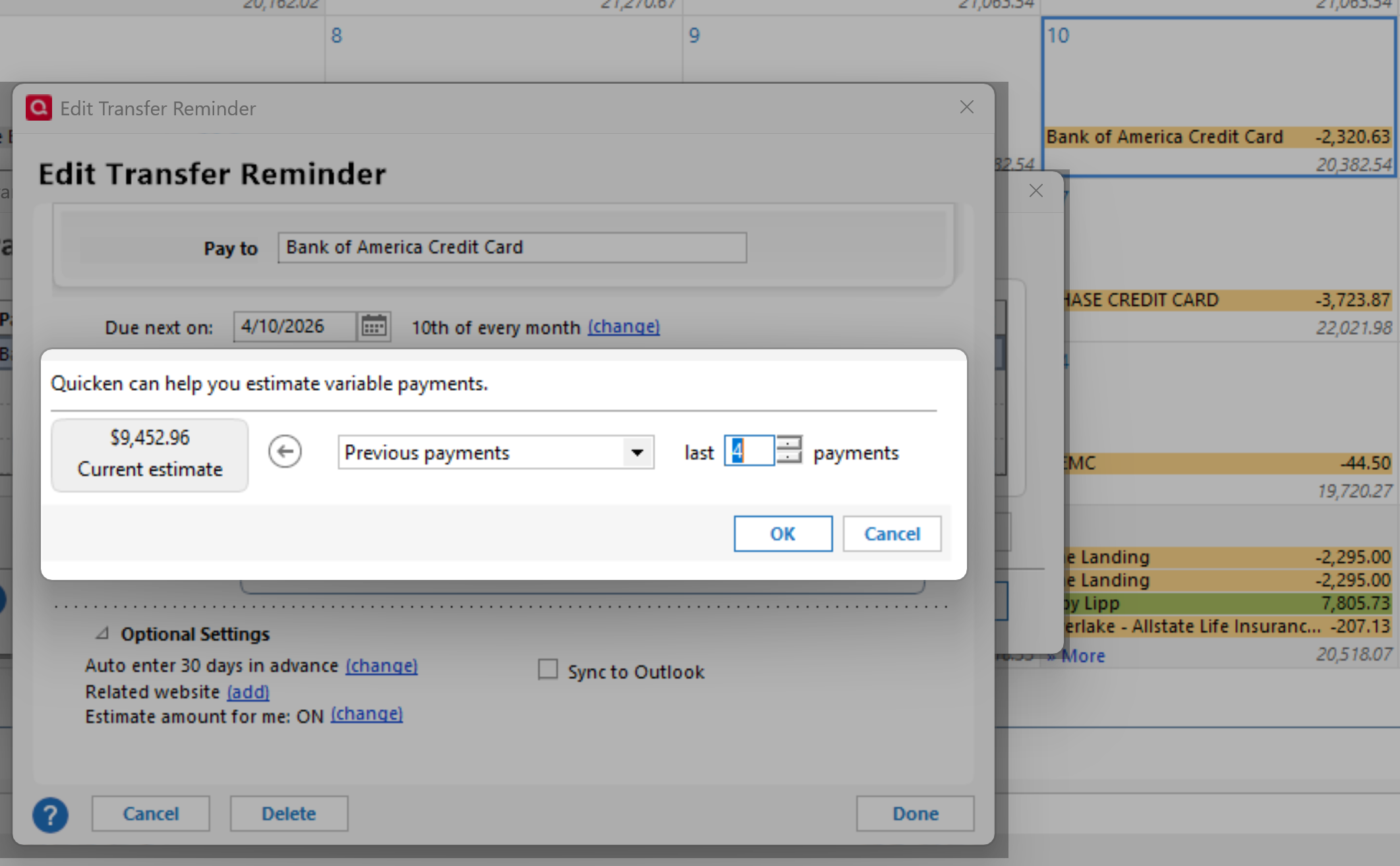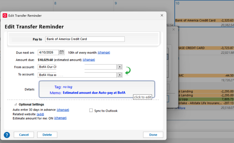 When I edit the reminder and change the payments to last 4 payments, the estimated amount due is correct,