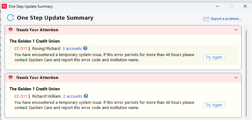 Thank you for getting back to me Alyssa, I just submitted my log files from my Quicken for Windows program. I referenced the "CC-511 Golden 1 Credit Union" subject in the title of the error report. Hope this data helps resolve this issue.
