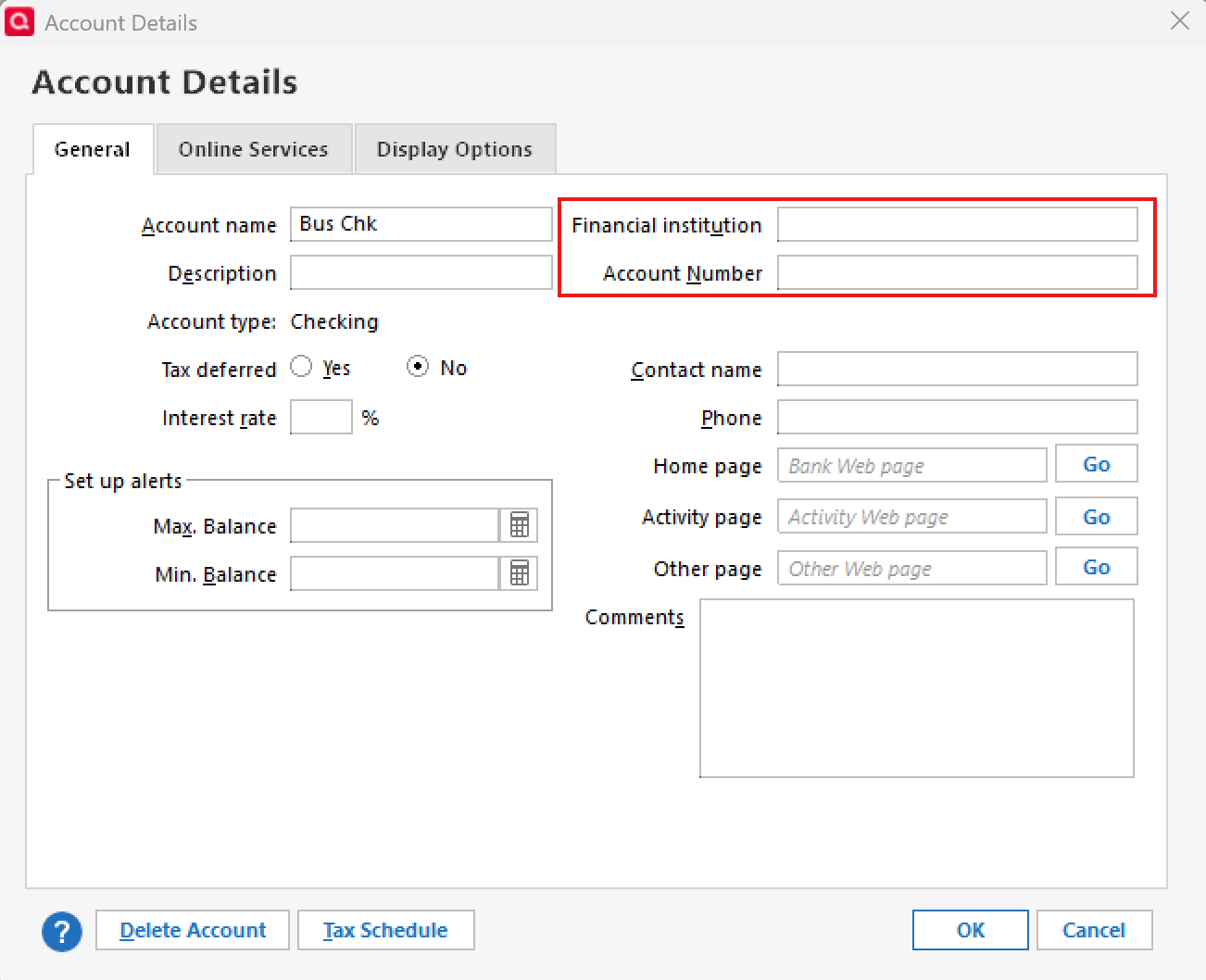 - In Quicken, go to Account Settings > General tab and remove the Bank of America financial institution name and account number from each affected account.