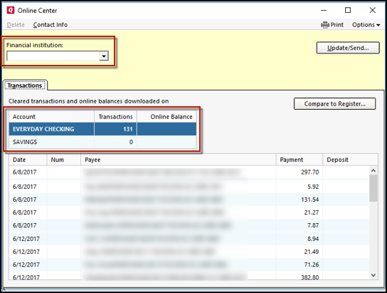 - If transactions are listed, click Compare to Register and accept the transactions. Note: Compare to Register will display online payments on the initial screen. After accepting your online payments, click Continue, Next or Done to see the rest of your downloaded transactions.