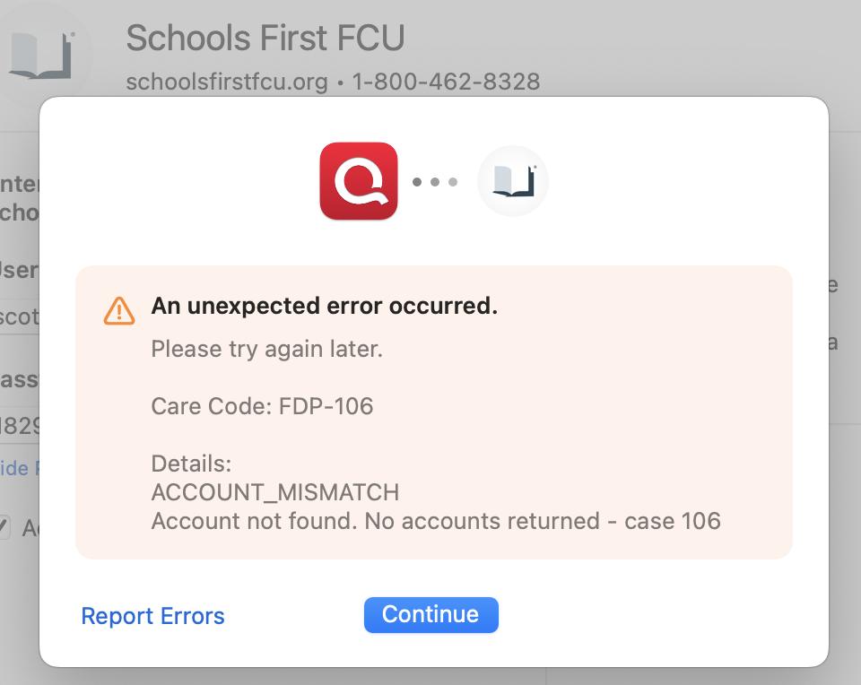 Error Adding Accounts from SchoolsFirst FCU - Error: FDP-106
