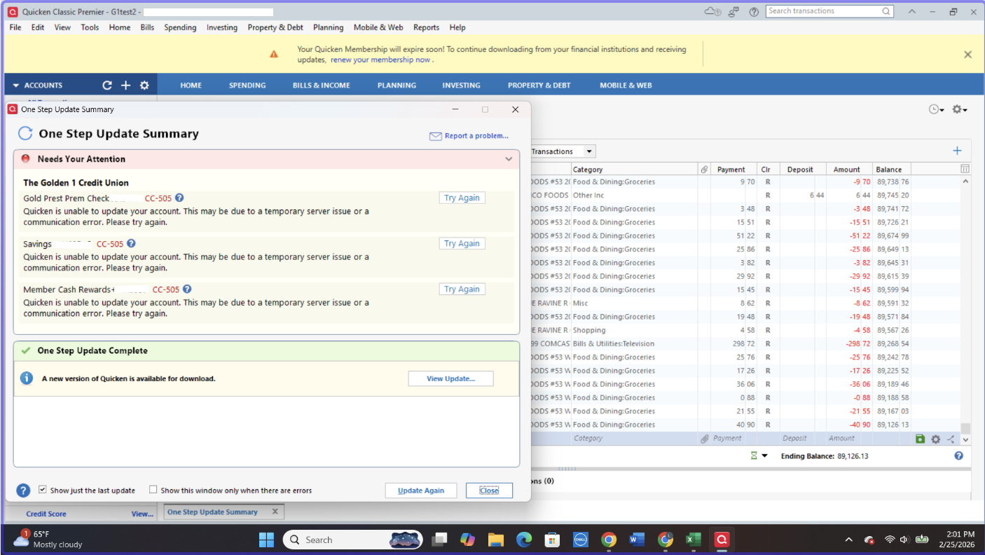 Golden 1 Credit Union Error CC-505 Quicken stopped connecting