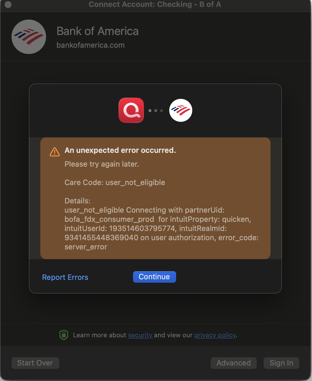 user_not_eligible Connecting with partnerUid: bofa_fdx_consumer_prod for intuitProperty: quicken, intuitUserId: 123145878052544, intuitRealmId: 9341454209672645 on user authorization, error_code: server_error0 -