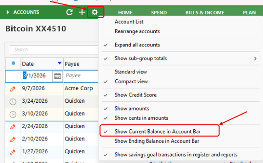 - Select Show Current Balance in Account Bar.