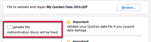 If initiated correctly, the Validate file checkbox will also show the message "Authentication block will be fixed" as pictured above.