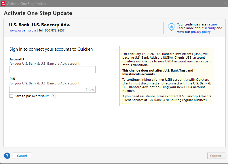 My US Bank IRA stopped downloading mid Feb. When I try to reconnects, the Quicken screen explains they changed their name. When I try my existing AccessID and PIN, it fails. I assume I need new AccessID and PIN.