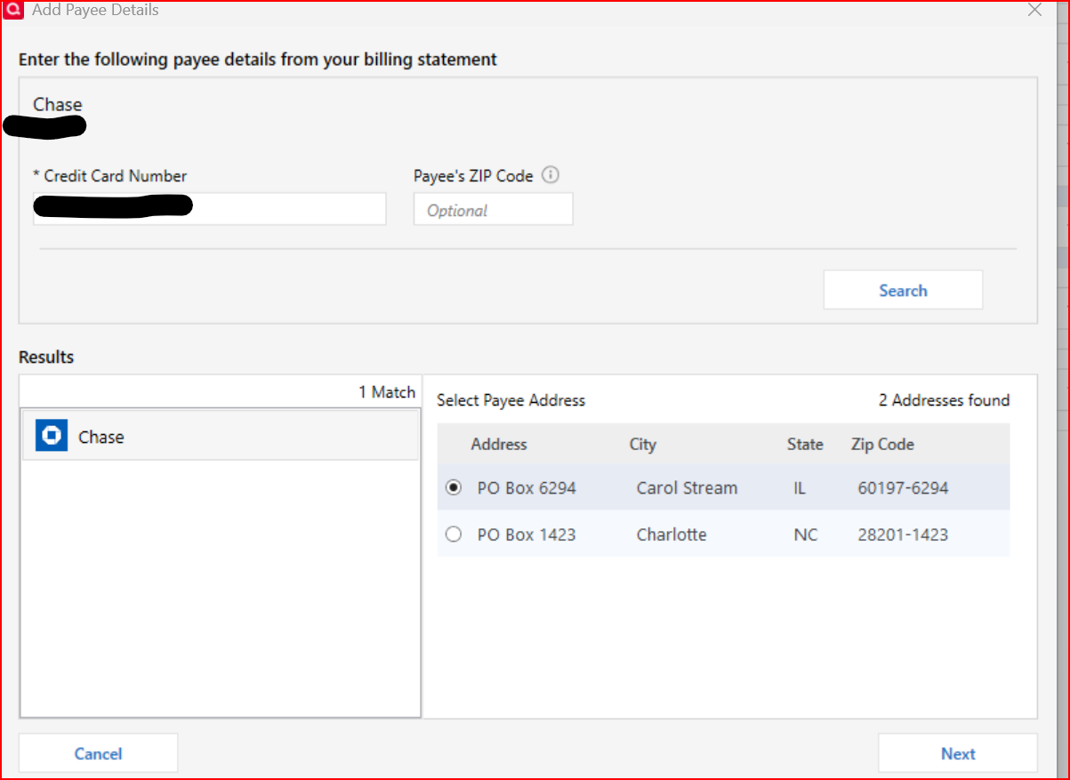 Bill Manager ==> Paying Chase Credit using Quick Pay ==> Add Payee Details