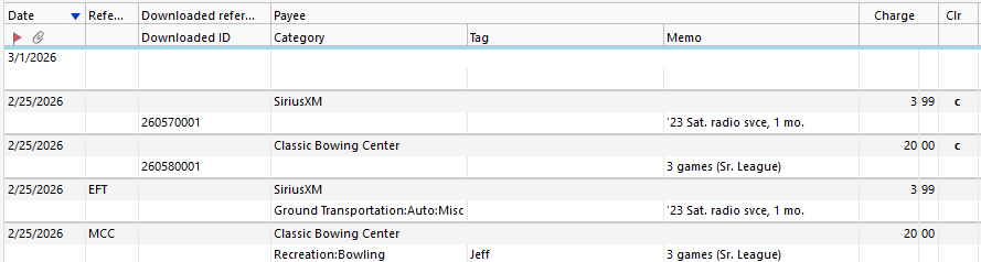 The transactions with more detail are those I entered manually (on the date shown). The transactions showing nothing but Payee, Date, amount, and Downloaded ID are those downloaded today. They showed "Match" in the register before I accept them (never auto-accept on download); when I accepted these they turned into new entries, as shown - matching Date, Payee, Amount. This is new behavior.