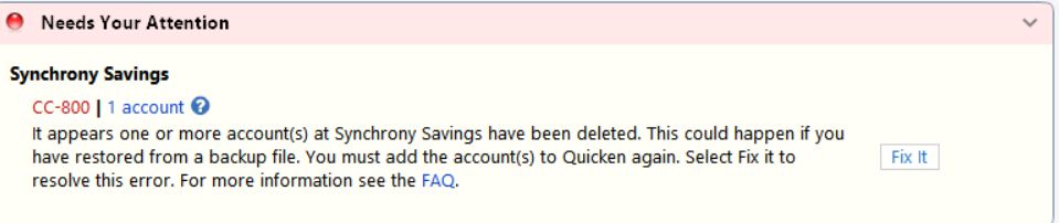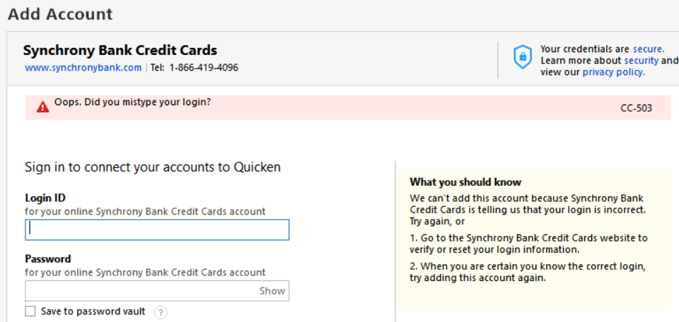 After the latest Quicken update, I am getting persistent C800 errors on ALL 5 of my Synchrony Bank cards (Lowes, Care Credit Mastercard, Ashley Advantage, Sams Club Mastercard, Sleep Number beds):