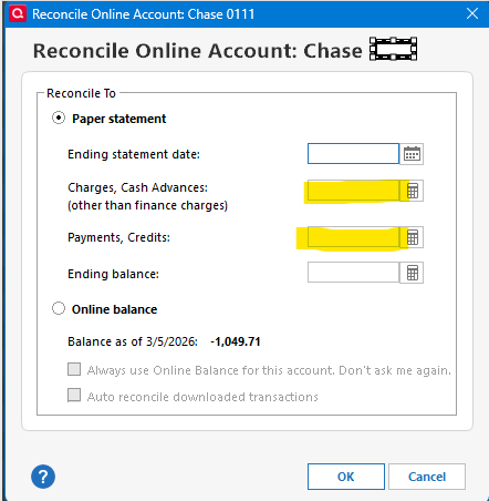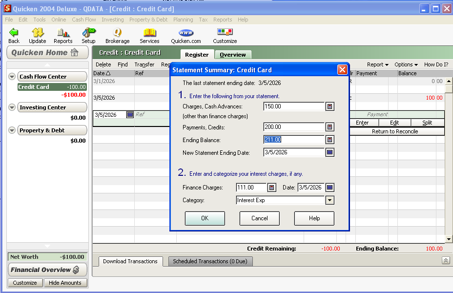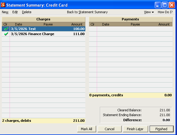 As you can see from the follow reconcile window, it added a transaction for the finance charge I entered for $111.00, but not for the Charges, Cash Advances ($150) and the Payments, Credits ($200).