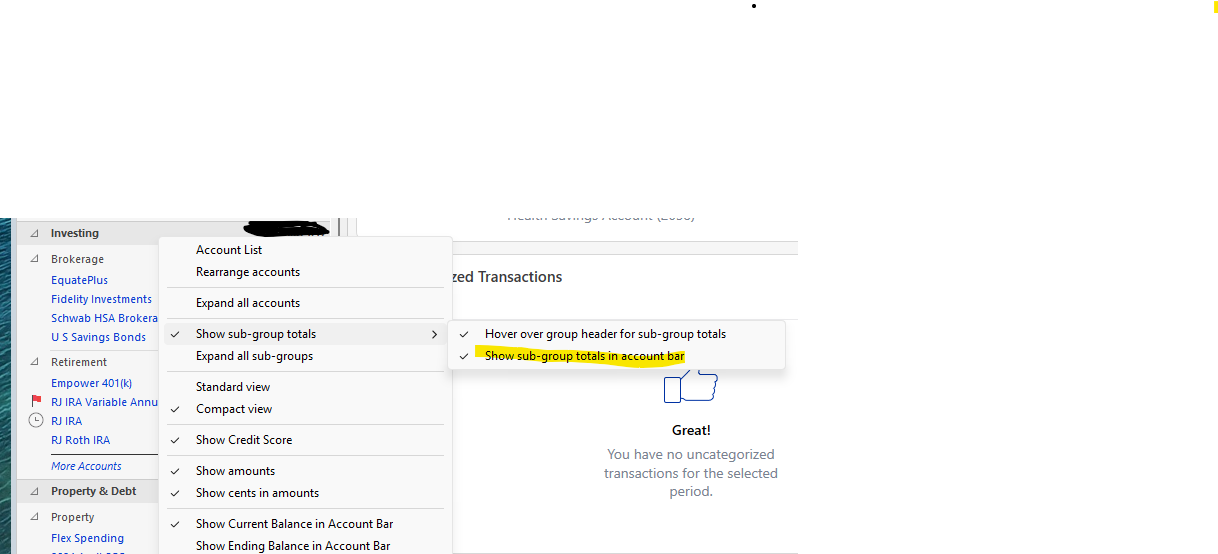 Right click on the Investing header and turn on "Show sub-group totals in account bar". This should help you understand what's going on.