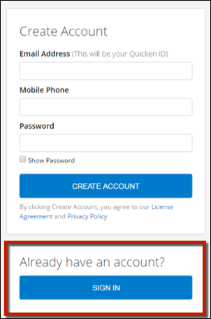 - Sign in with your Quicken ID. If prompted to create a new one but you already have an account, click Sign In under the Create Account prompt.