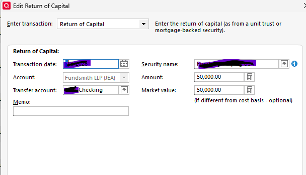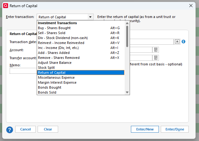 Thank you Tom. How would you suggest i enter the decrease in cost basis? I don't see a relevant filed in the 'enter transaction' dropdown?