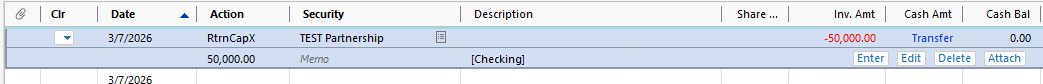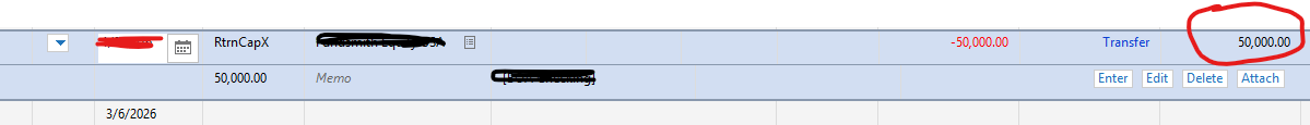 OK. I created a RtrnCapX entry to reflect an actual redemption of $50,000 that i then transferred to my checking account back in January, here's what happened: