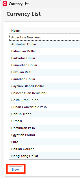 Since Colombian pesos aren't already on the list, you can add the currency. Click the New button.