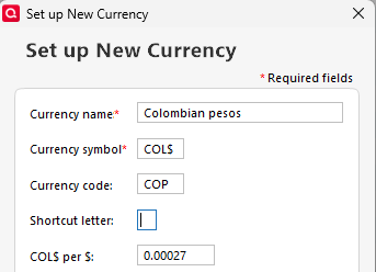 I need to track deposits/payments in a Colombian bank, but there is no option to track COPs! And a way to separately track deposits/payments in COP. ugh!! Lots of other currencies being tracked.