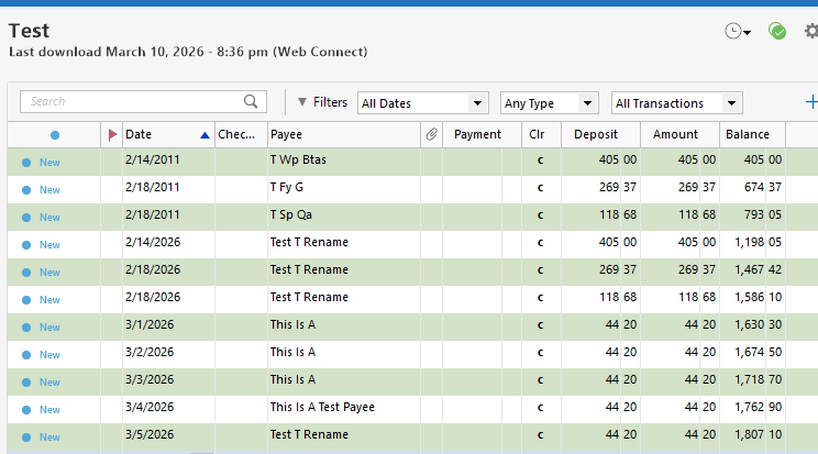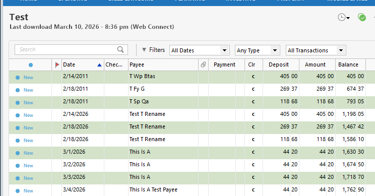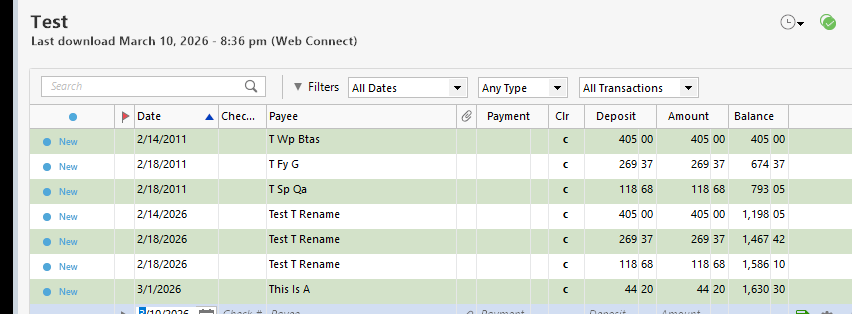 Tried again with the last transaction having a new date, same result. Tried with different date and deleting the renaming rule, same result. So, whatever the problem is, it isn't the renaming rule it is just something about the payee that Quicken is messing with….