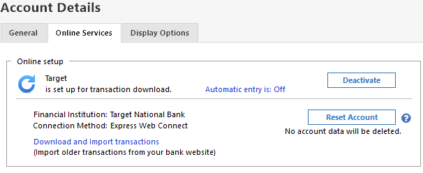 Please do TOOLS, Account List. What shows in the "Transaction Download", "Last Download" and "Financial Institution" columns next to your Target account?