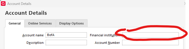 NotaCPA: "For an account that isn't connected, you should be able to change the FI name on the General tab of the Account Details dialog, which you displayed above."